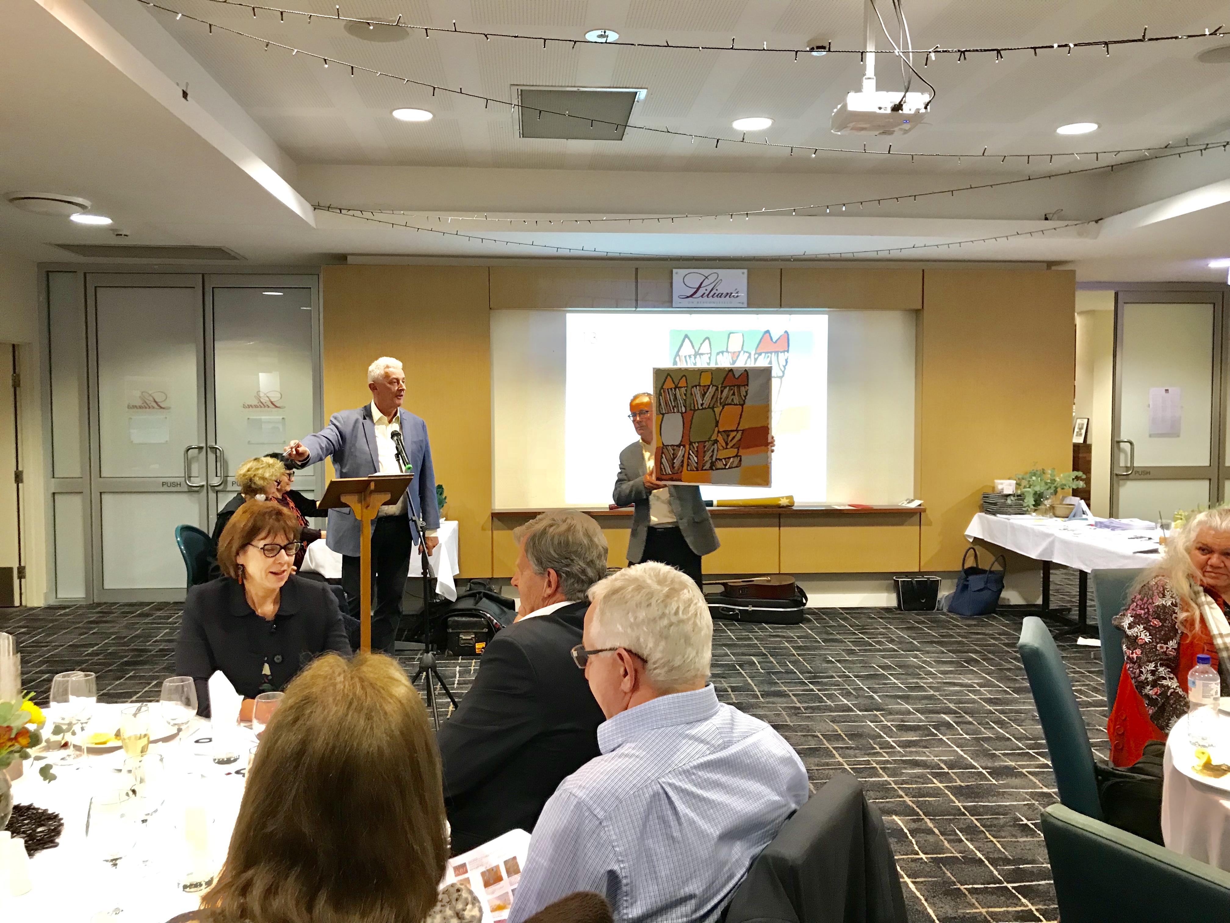 Forty-six items were up for auction (view the art auction catalogue here), including exquisite works from Pat Brassington, Mick Glasheen, Tim Johnson, Ngarrawanajirri Tiwi artists, Gary Shead, Tony Tuckson, Peter Kingston and many others. Auctioneer Roger McIlroy led some exciting bidding, with several works selling above their value. We are delighted to announce that in excess of $33,000 was raised and we thank all those who supported the auction.